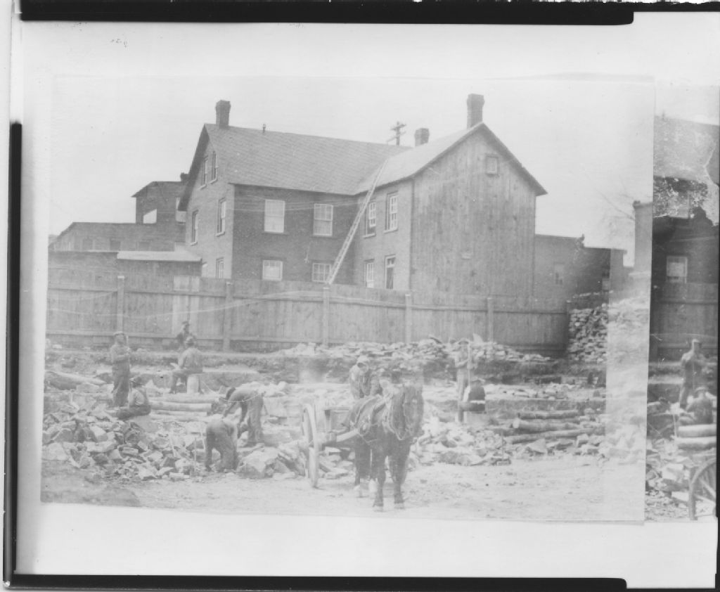 Travailleurs (avec cheval et chariot) déblayant un terrain vague à Hull; clôture en bois et maison en bois en arrière-plan