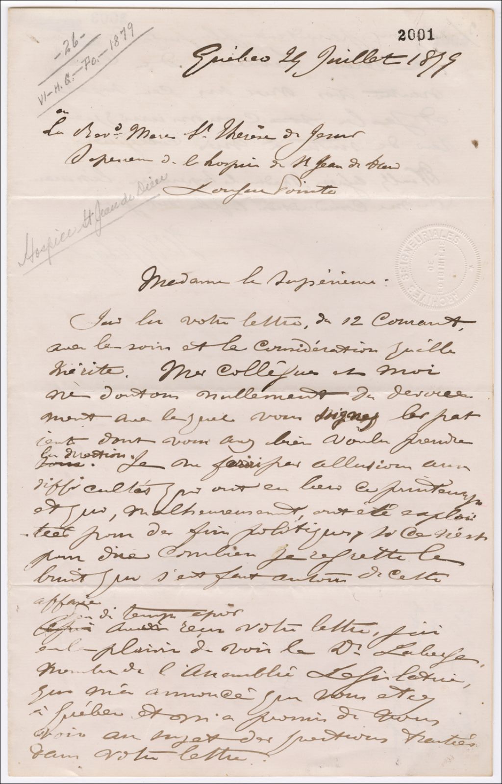 Lettre de Henri-Gustave Joly à Soeur Marie Sainte-Thérèse de Jésus [Hospice Saint-Jean-de-Dieu]