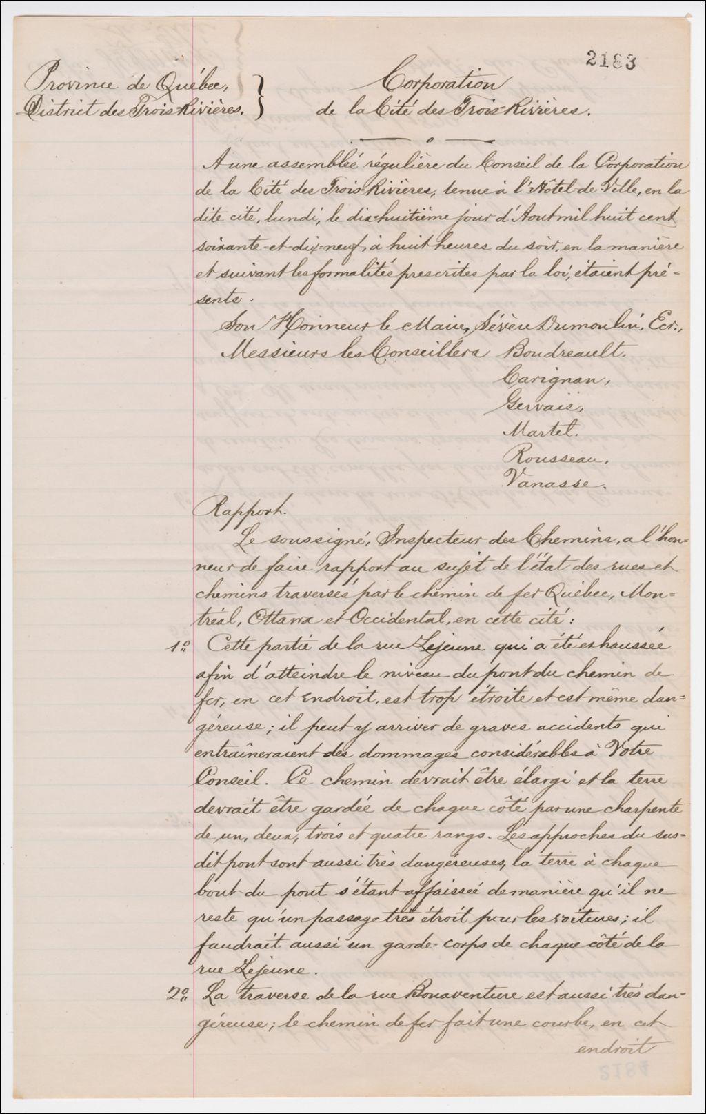 Rapport de l'Inspecteur des chemins au sujet de l'état des rues et chemins traversés par le Chemin de fer Québec, Montréal, Ottawa et Occidental (QMO&O) à Trois-Rivières, 18 août 1879, Archives nationales à Québec, Fonds Famille Joly de Lotbinière, (03Q,P351,S4,SS1,P2183).