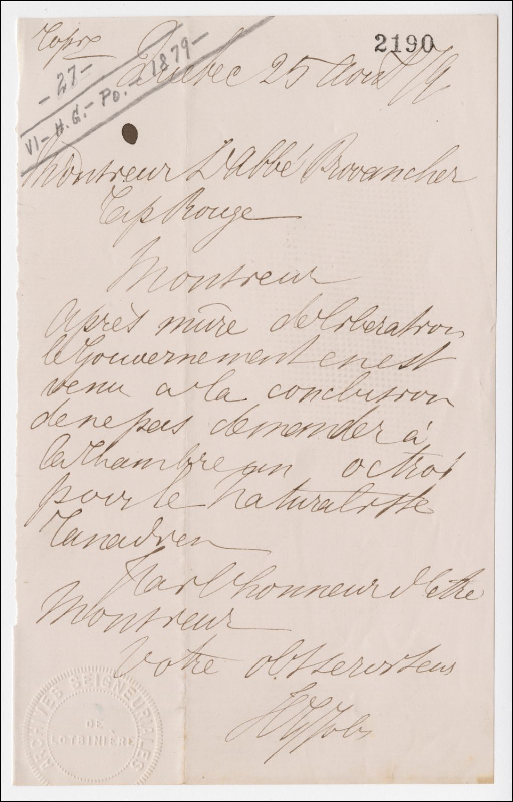 Brouillon de lettre de Henri-Gustave Joly à l'Abbé Léon Provancher, 25 août 1879, Archives nationales à Québec, Fonds Famille Joly de Lotbinière, (03Q,P351,S4,SS1,P2190).