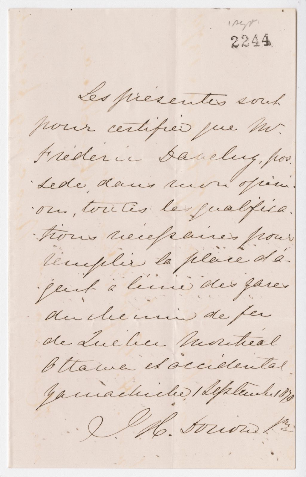 Certificat pour J. H. Dorion prêtre recommandant Frederick Daveluy pour la position d'agent sur le chemin de fer Chemin de fer Québec, Montréal, Ottawa et Occidental (QMO&O), 1er septembre 1879, Archives nationales à Québec, Fonds Famille Joly de Lotbinière, (03Q,P351,S4,SS1,P2244).