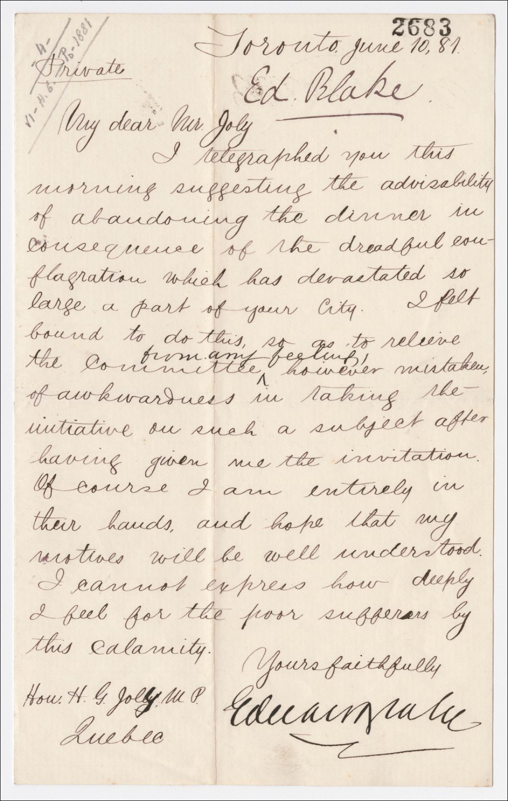 Lettre d'Edward Blake à Henri-Gustave Joly, 10 juin 1881, Archives nationales à Québec, Fonds Famille Joly de Lotbinière, (03Q,P351,S4,SS1,P2683).