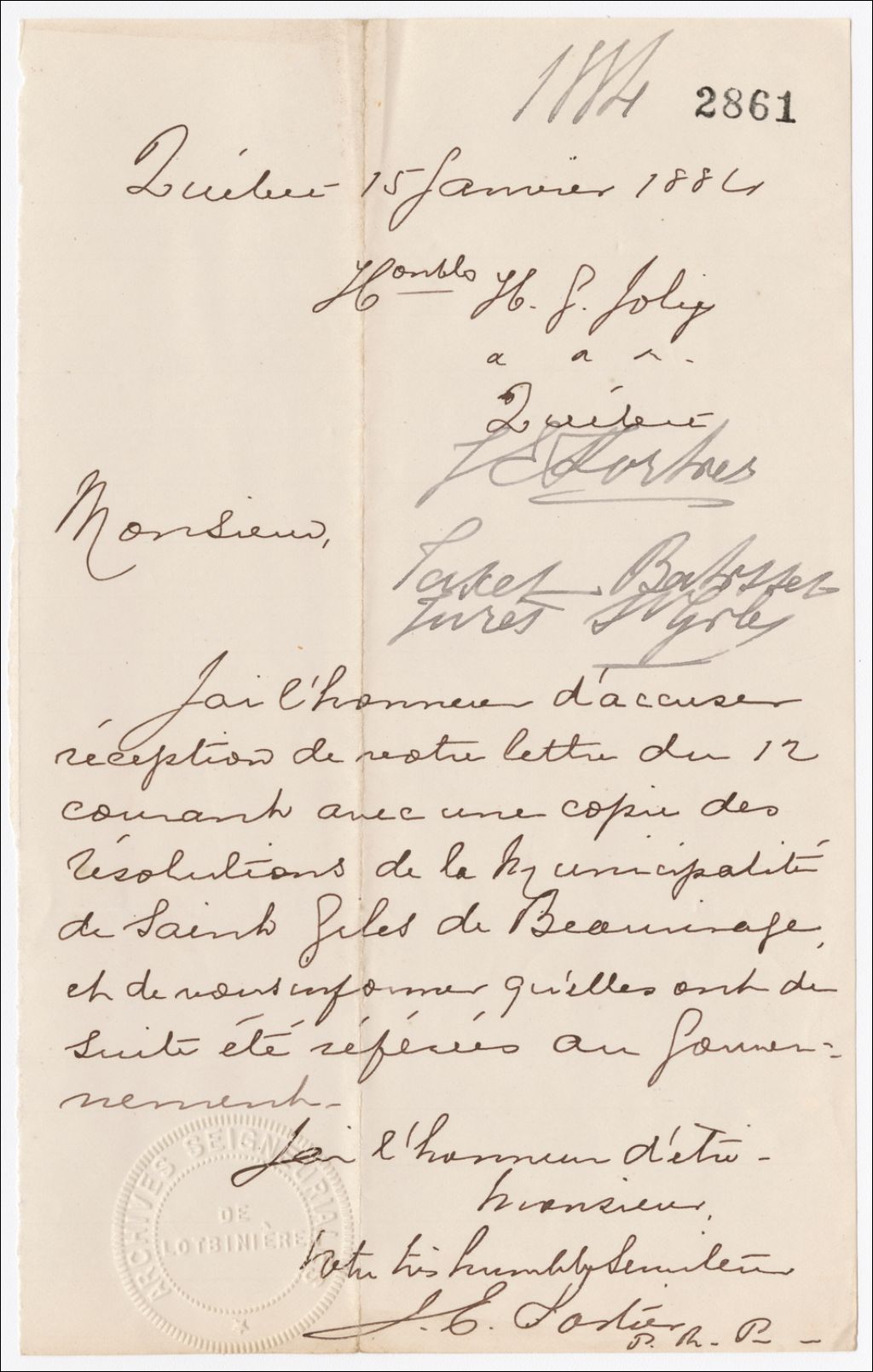 Lettre de J. E. Fortier à Henri-Gustave Joly, 15 janvier 1884, Archives nationales à Québec, Fonds Famille Joly de Lotbinière, (03Q,P351,S4,SS1,P2861).