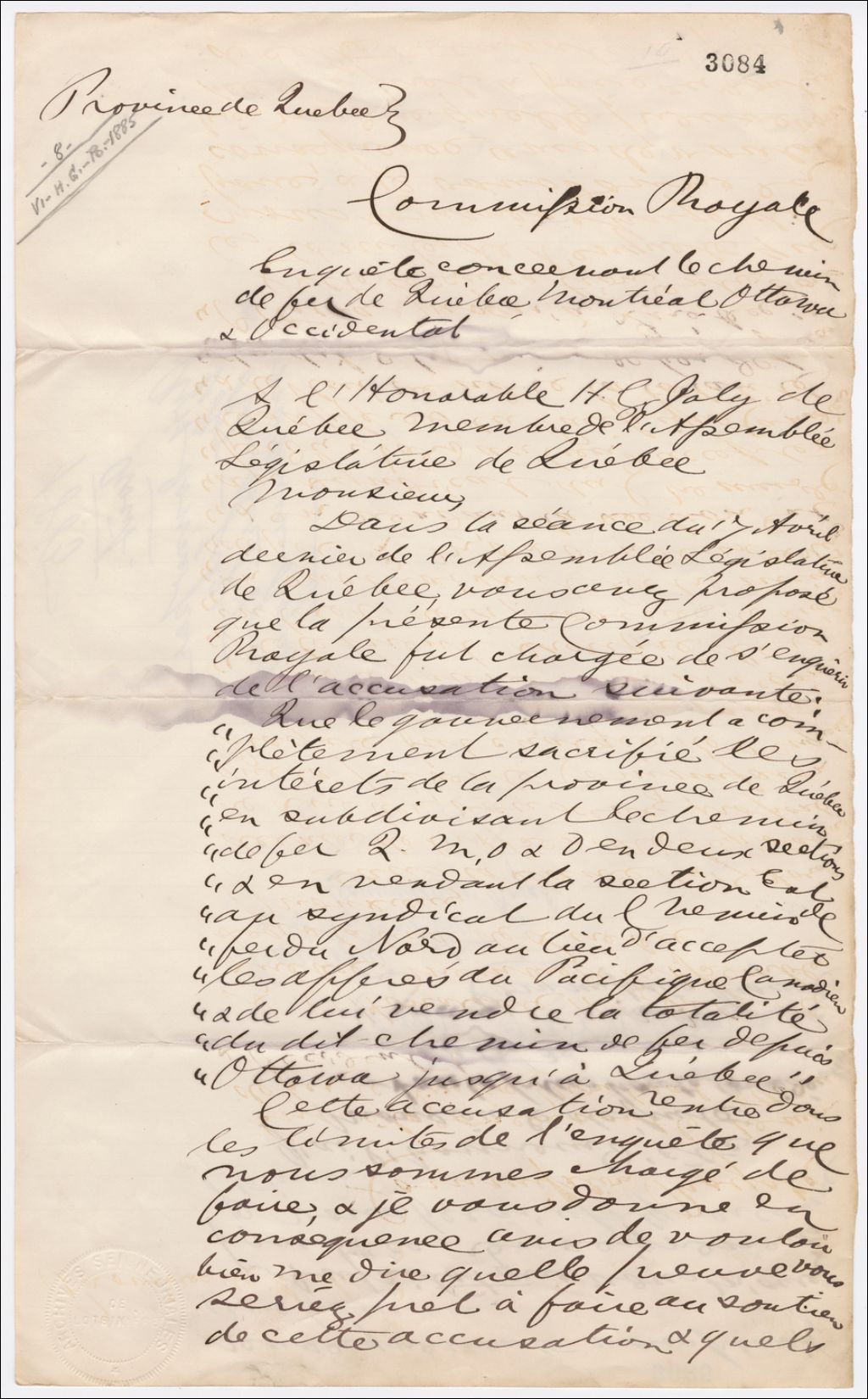 Avis du juge Adolphe-Basile Routhier, commissaire royal dans l'enquête sur le chemin de fer Chemin de fer Québec, Montréal, Ottawa et Occidental (QMO&O) donné à Henri-Gustave Joly, août 1885, Archives nationales à Québec, Fonds Famille Joly de Lotbinière, (03Q,P351,S4,SS1,P3084).