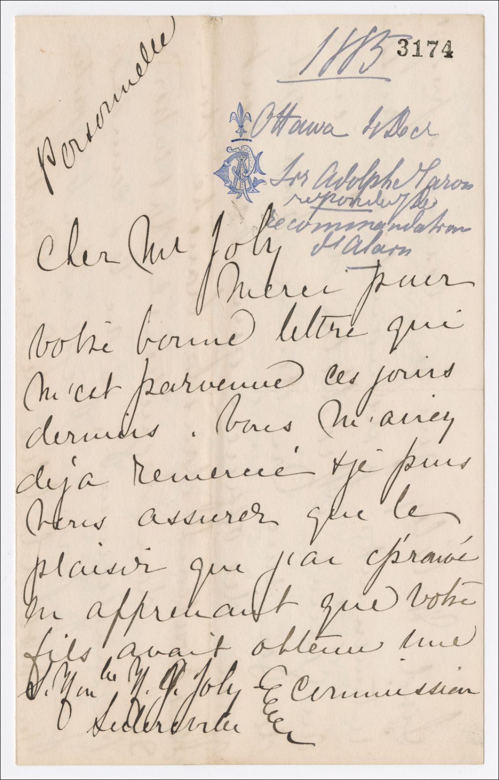 Lettre d'Adolphe Caron à Henri-Gustave Joly, 4 décembre 1885, Archives nationales à Québec, Fonds Famille Joly de Lotbinière, (03Q,P351,S4,SS1,P3174).