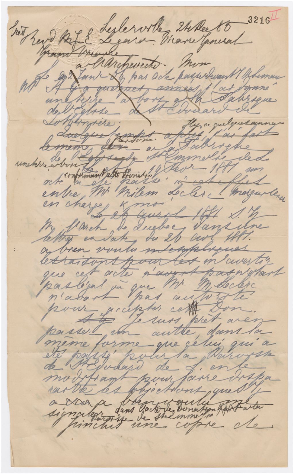 Brouillon de lettre de Henri-Gustave Joly au Vicaire général Cy. E. Légaré, 24 décembre 1885, Archives nationales à Québec, Fonds Famille Joly de Lotbinière, (03Q,P351,S4,SS1,P3216).