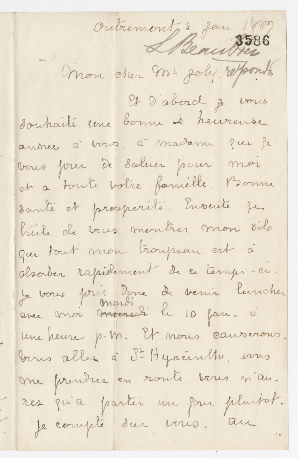 Lettre de Louis Beaubien à Henri-Gustave Joly