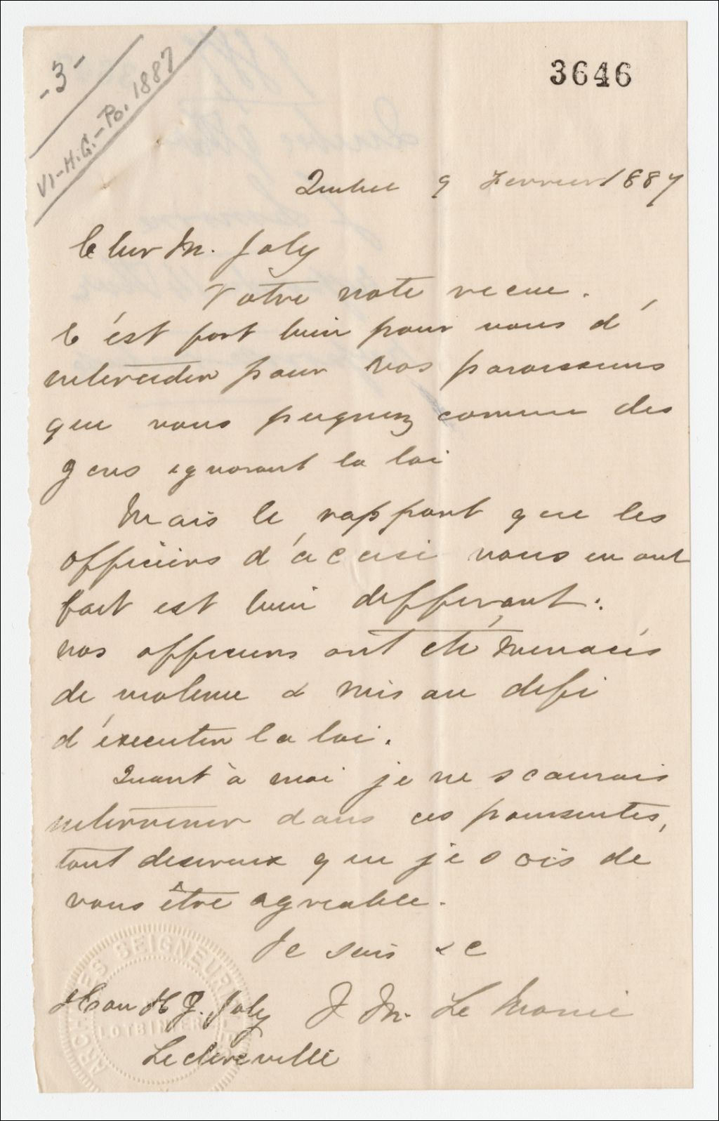Lettre de J. M. LeMoine à Henri-Gustave Joly