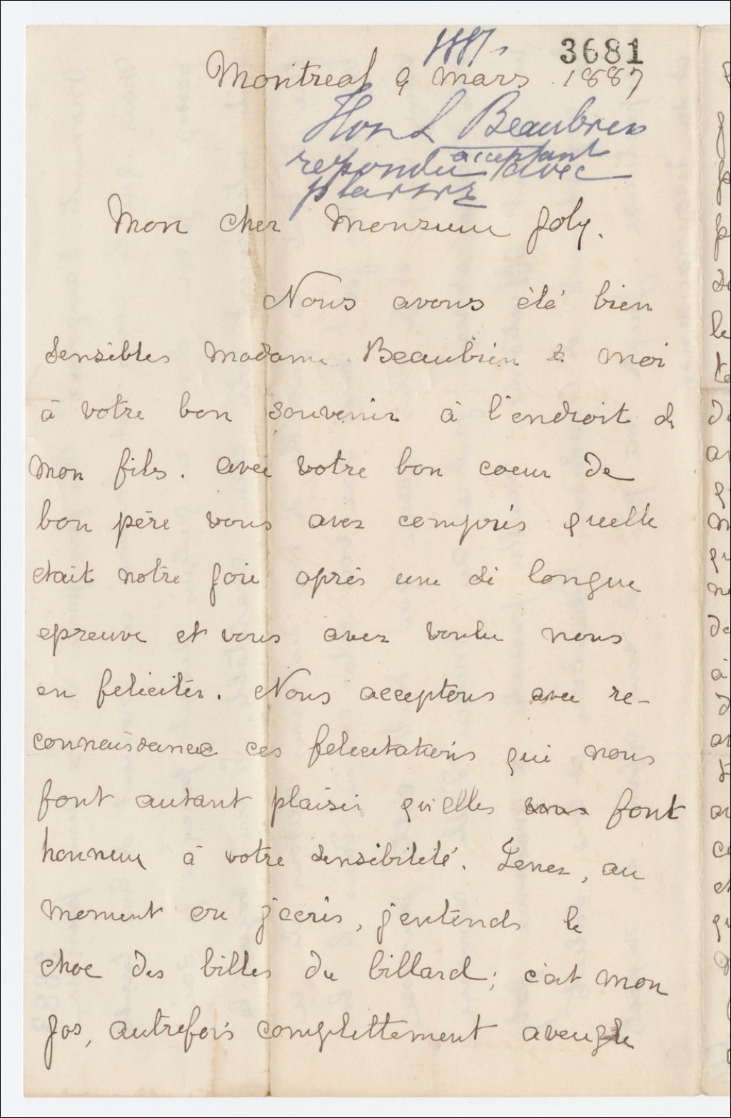 Lettre de Louis Beaubien à Henri-Gustave Joly