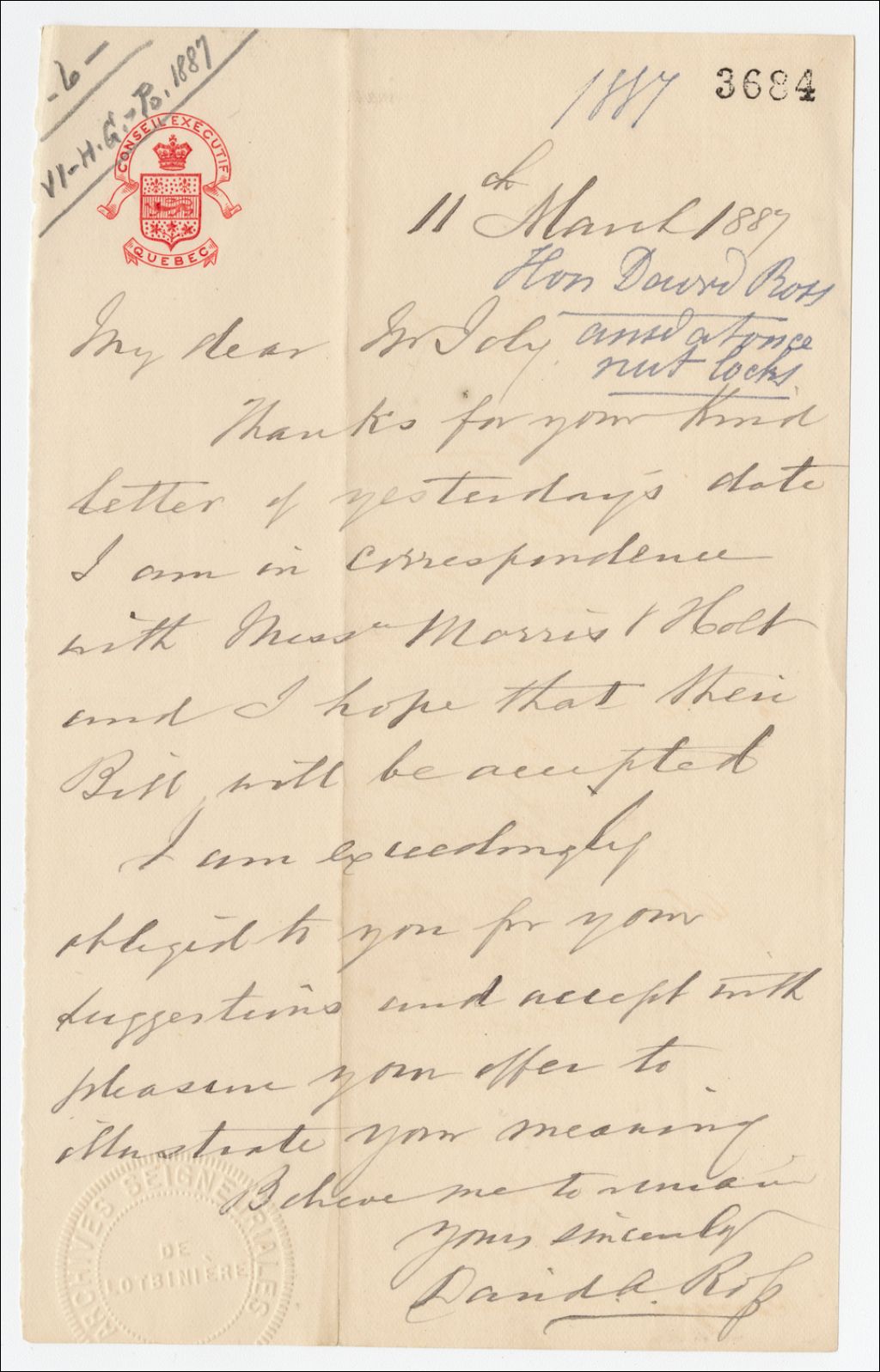 Lettre de David A. Ross à Henri-Gustave Joly, 11 mars 1887, Archives nationales à Québec, Fonds Famille Joly de Lotbinière, (03Q,P351,S4,SS1,P3684).
