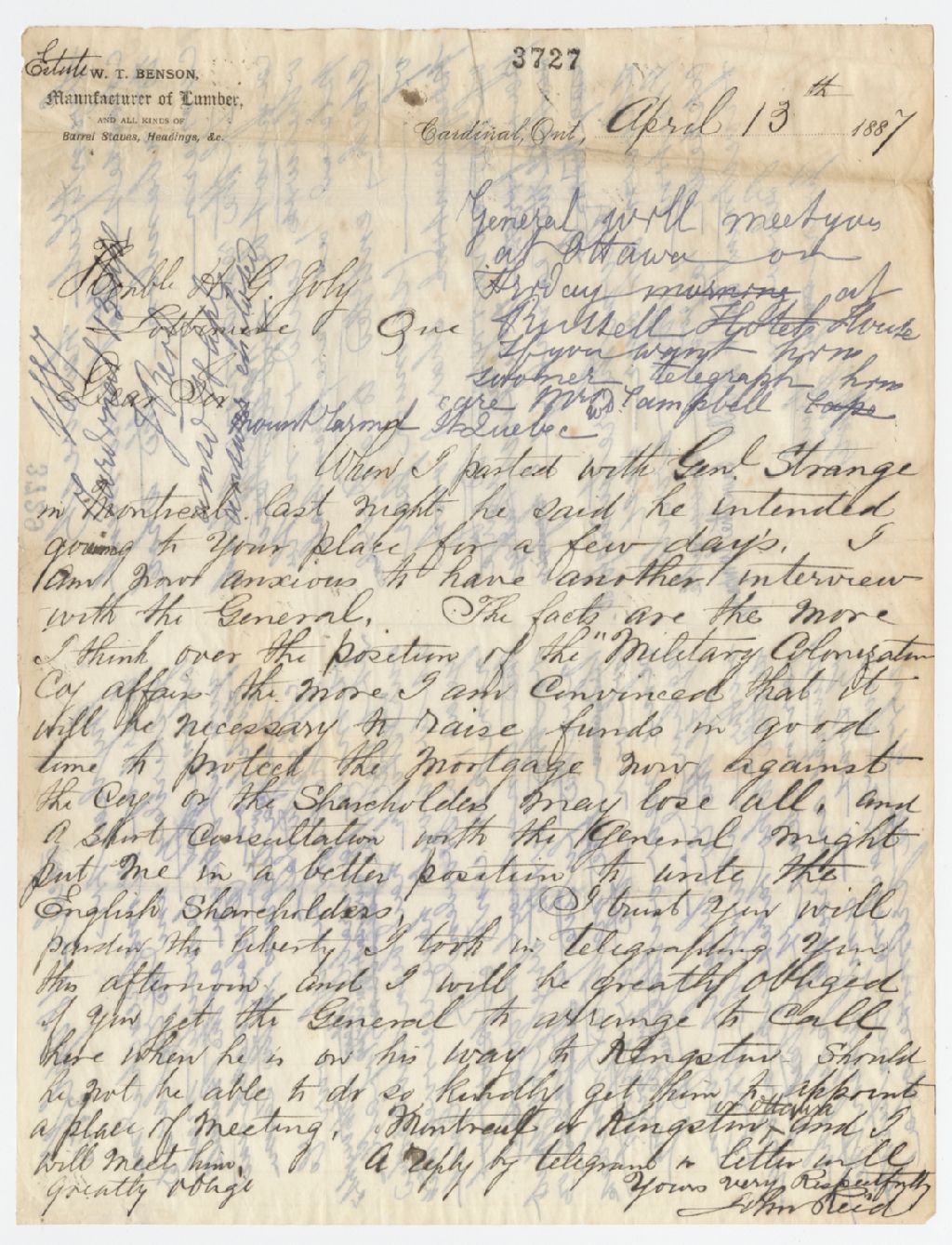 - Désire rejoindre le général Strange pour obtenir plus d'informations sur les affaires du ranch. Réponse de Joly au verso. 2 pages. Le général le rencontrera à l'Hôtel Russell à Ottawa vendredi prochain. Lui a envoyé un télégramme à ce sujet. La position de la compagnie est plus favorable qu'il pensait. Propose un moyen qui pourrait sauver la compagnie