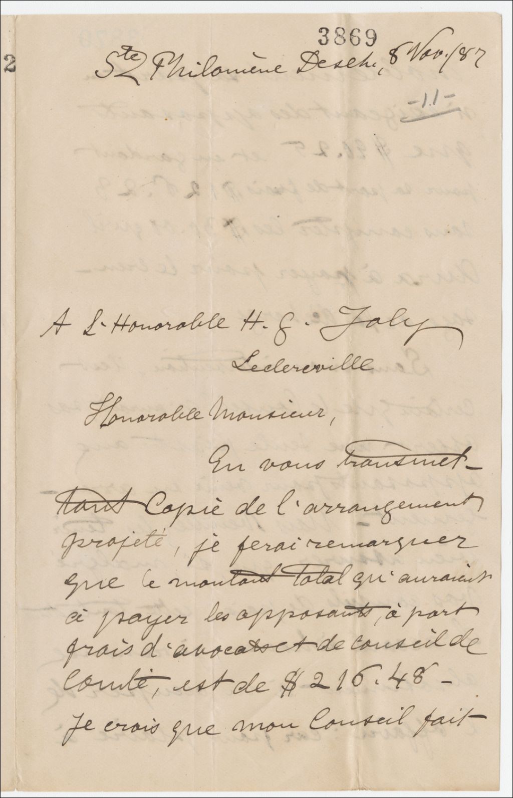 - Lui transmet copie de l'arrangement projeté. Montant à payer par les opposants. Croit que le Conseil fait noblement sa part en n'exigeant pas plus. Sans son intervention le Conseil n'aurait pas offert une seule piastre aux opposants. Si cette tentative d'entente échoue, il renonce absolument à s'occuper de l'affaire, car pour leur plaire, il ne peut s'exposer davantage à déplaire à la messe de sa paroisse, seulement six paroissiens sont favorables à la cause des opposants