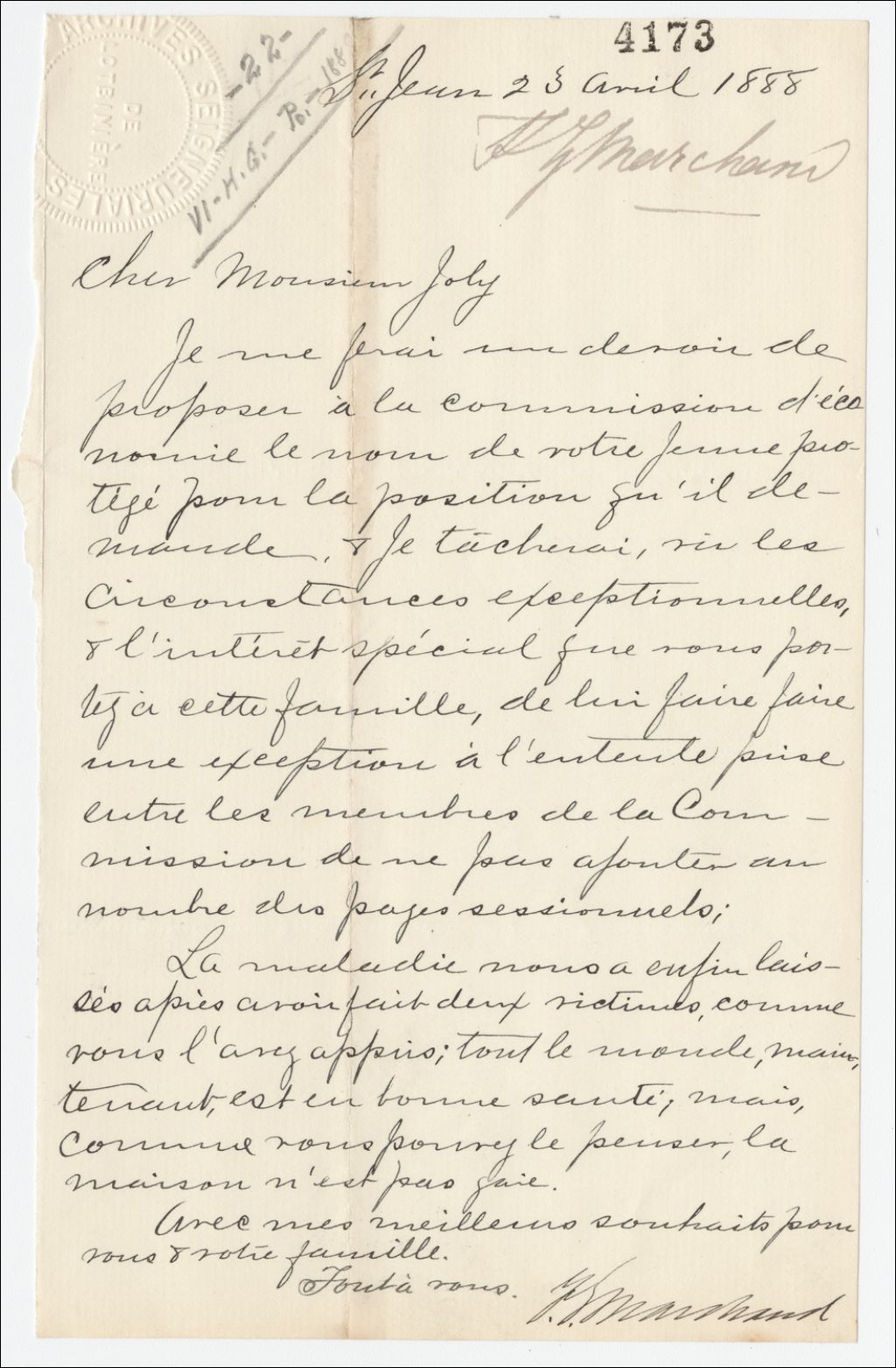 Se fera un devoir de proposer à la commission d'économie le nom de son jeune protégé pour la position qu'il demande. Vu les circonstances exceptionnelles et l'intérêt spécial que Joly porte à cette famille il fera exception à l'entente prise entre les membres de la commission de ne pas ajouter au nombre des pages sessionnelles. La maladie a enfin laissé sa famille. Tout le monde est maintenant en bonne santé, mais après deux mortalités, la maison n'est pas gaie