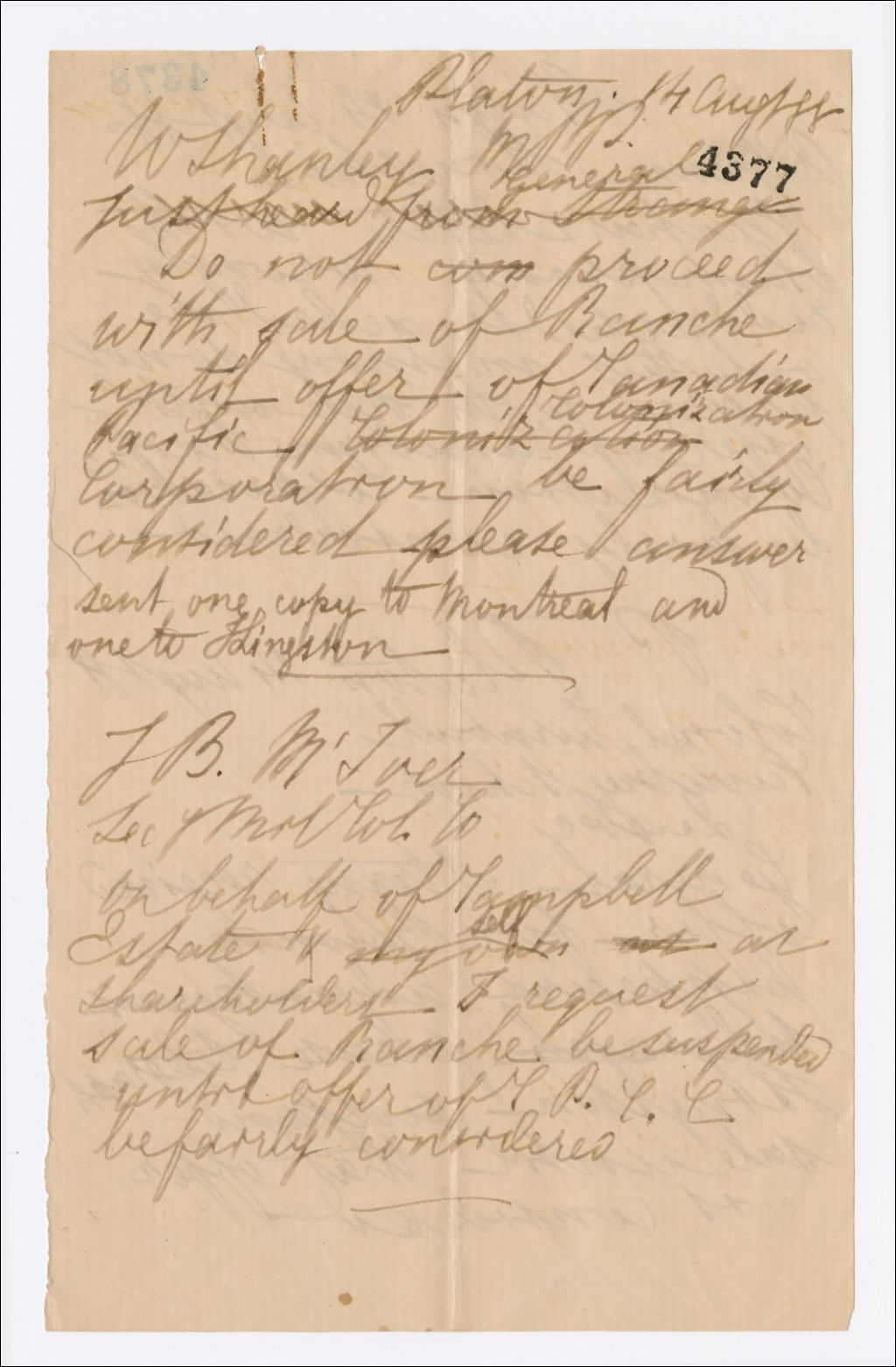 Brouillon de lettre de Henri-Gustave Joly à Walter Shanly, J. B. McIver, A. Gunn et J. F. Turnbull, 14 août 1888, Archives nationales à Québec, Fonds Famille Joly de Lotbinière, (03Q,P351,S4,SS1,P4377).