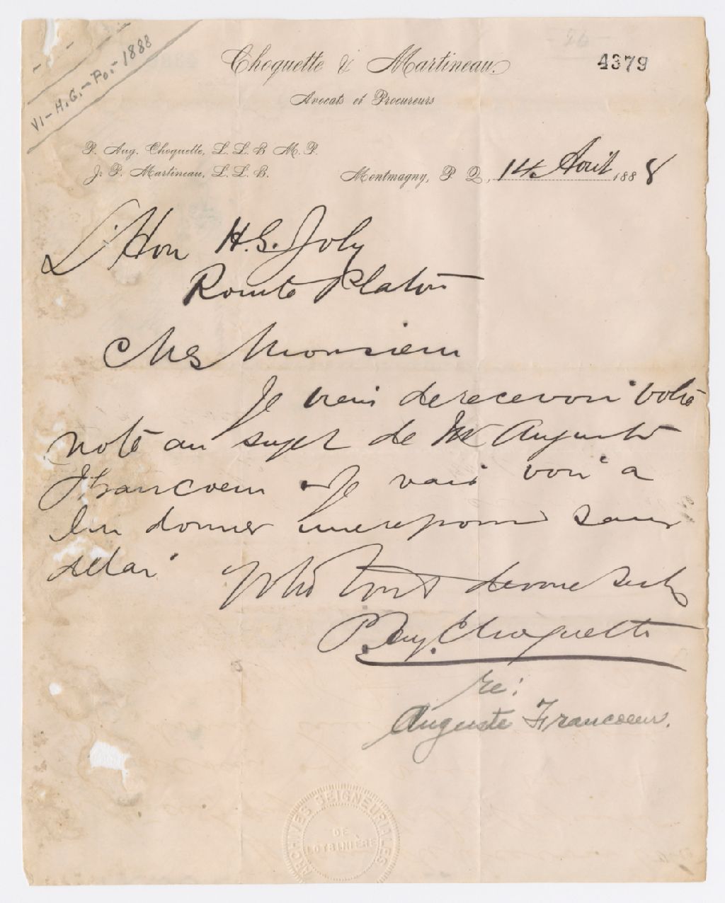 - Lettre de P. Aug. Choquette à Henri-Gustave Joly