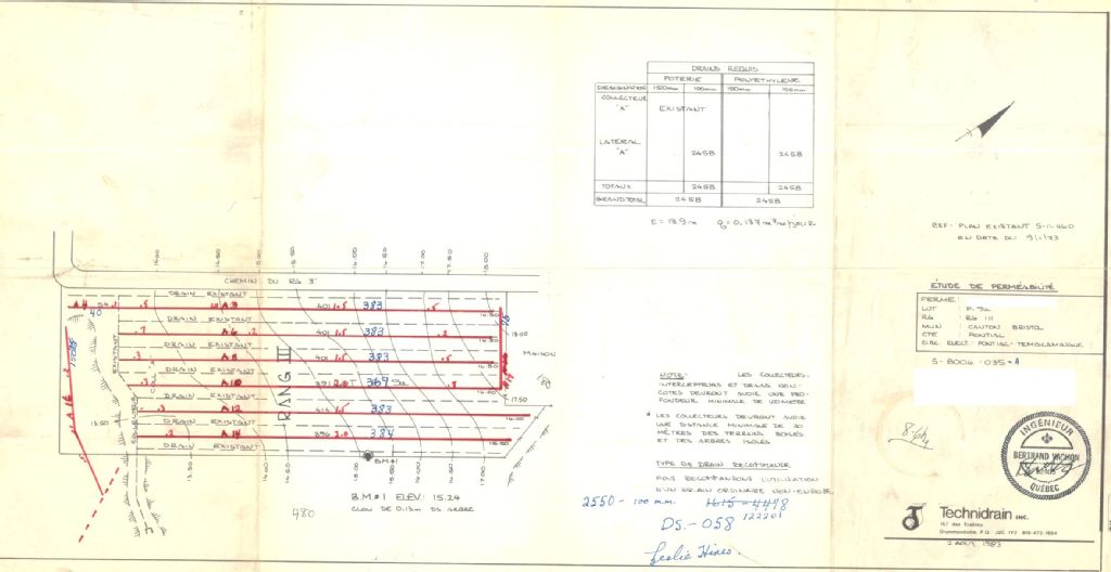 Plan de drainage souterrain (étude de perméabilité) annoté pour la municipalité du canton de Bristol, comté de Pontiac. Préparé pour le compte du Ministère de l¿Agriculture du Québec.