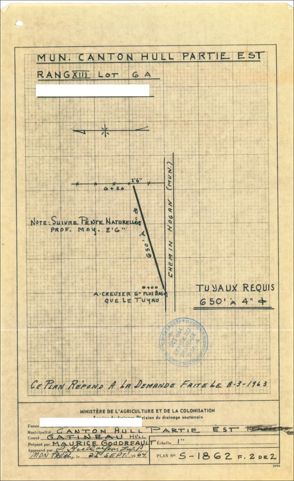 Plan de drainage souterrain pour la municipalité du canton de Hull (Partie-Est), comté de Gatineau. Préparé pour le compte du Ministère de l¿Agriculture et de la Colonisation du Québec.
