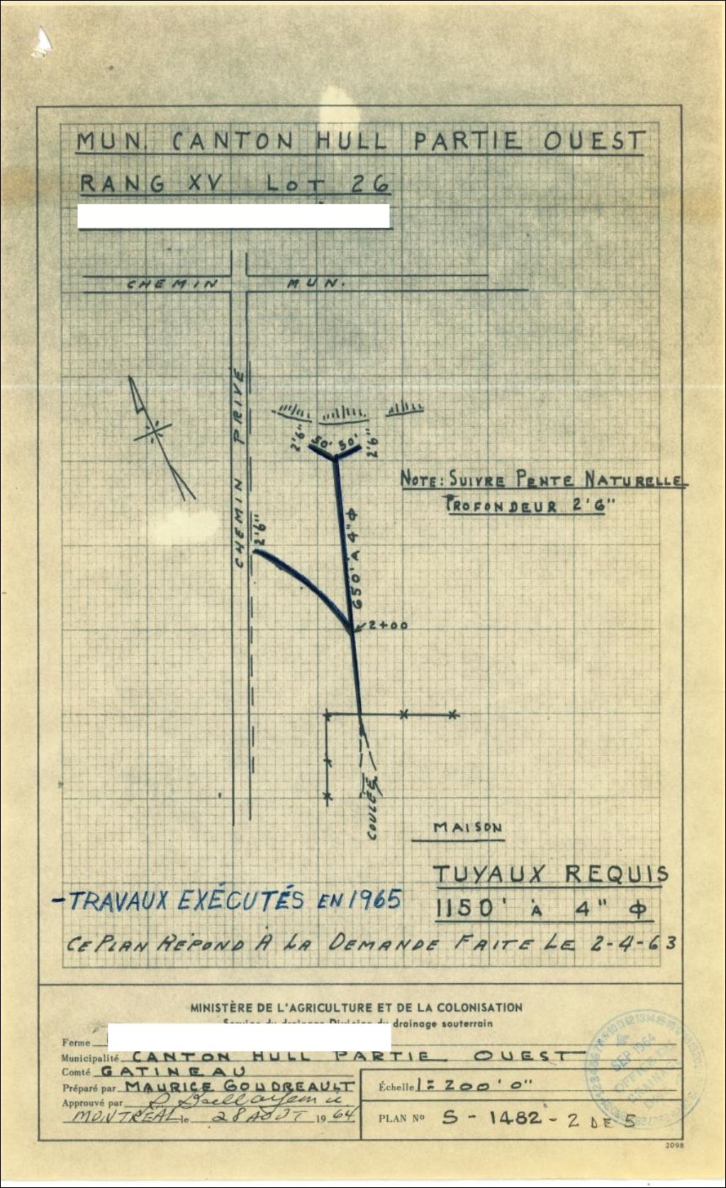 Plan de drainage souterrain annoté pour la municipalité du canton de Hull (Partie-Ouest), comté de Gatineau. Préparé pour le compte du Ministère de l¿Agriculture et de la Colonisation du Québec.