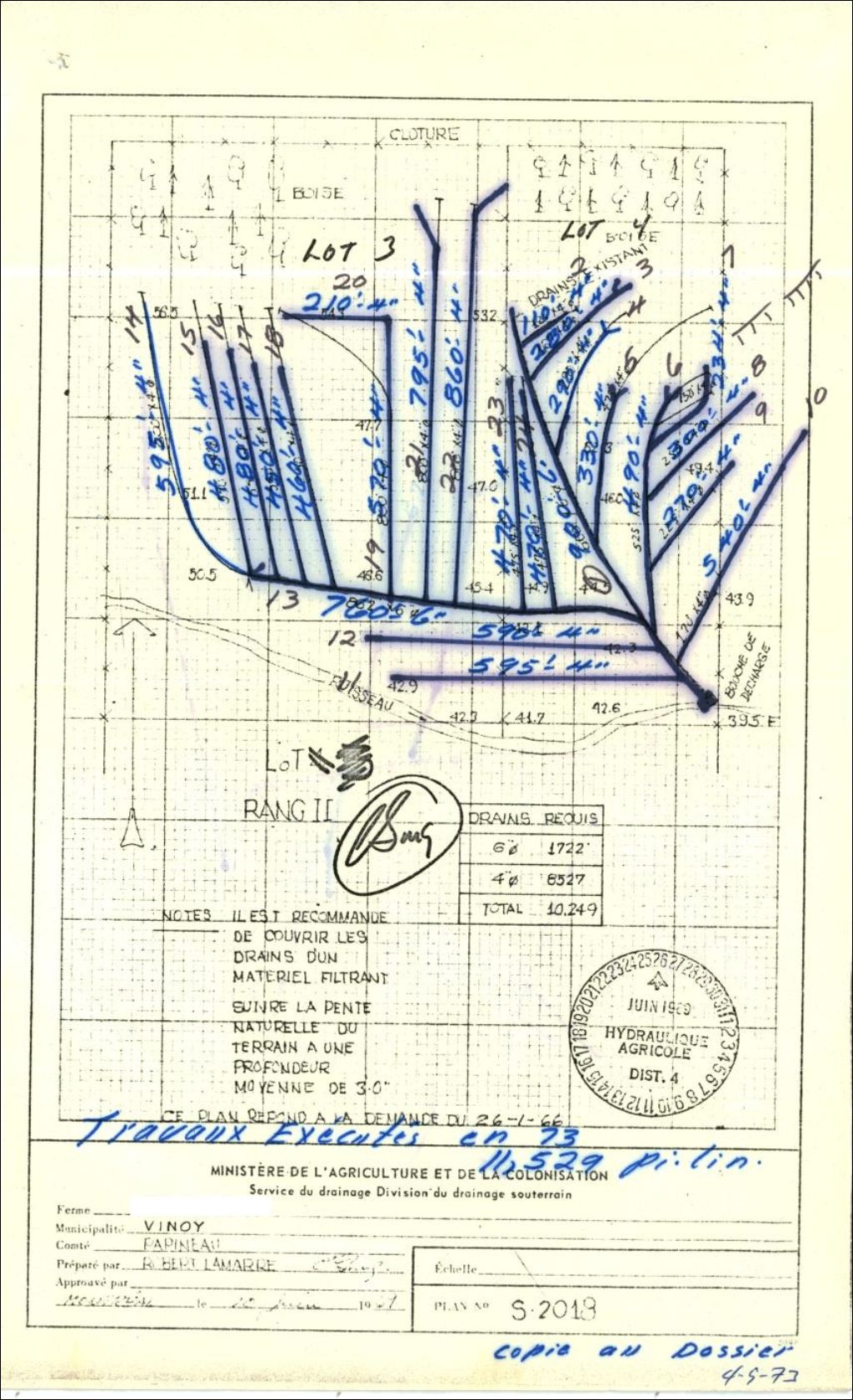 Plan de drainage souterrain annoté pour la municipalité de Vinoy, comté de Papineau. Préparé pour le compte du Ministère de l¿Agriculture et de la Colonisation du Québec.