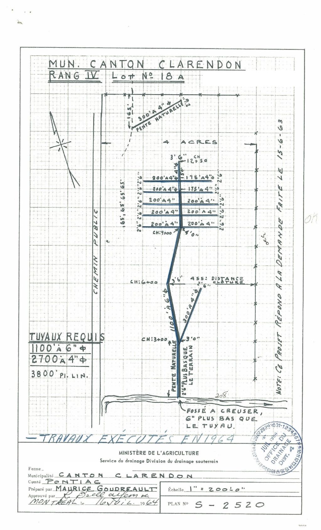 Plan de drainage souterrain annoté pour la municipalité du canton de Clarendon, comté de Pontiac. Préparé pour le compte du Ministère de l¿Agriculture du Québec.