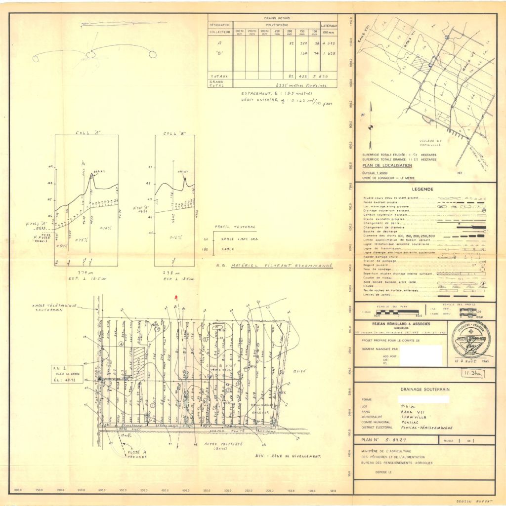 Plan de drainage souterrain annoté pour la municipalité de Shawville, comté de Pontiac. Préparé pour le compte du Ministère de l¿Agriculture, des Pêcheries et de l'Alimentation du Québec.