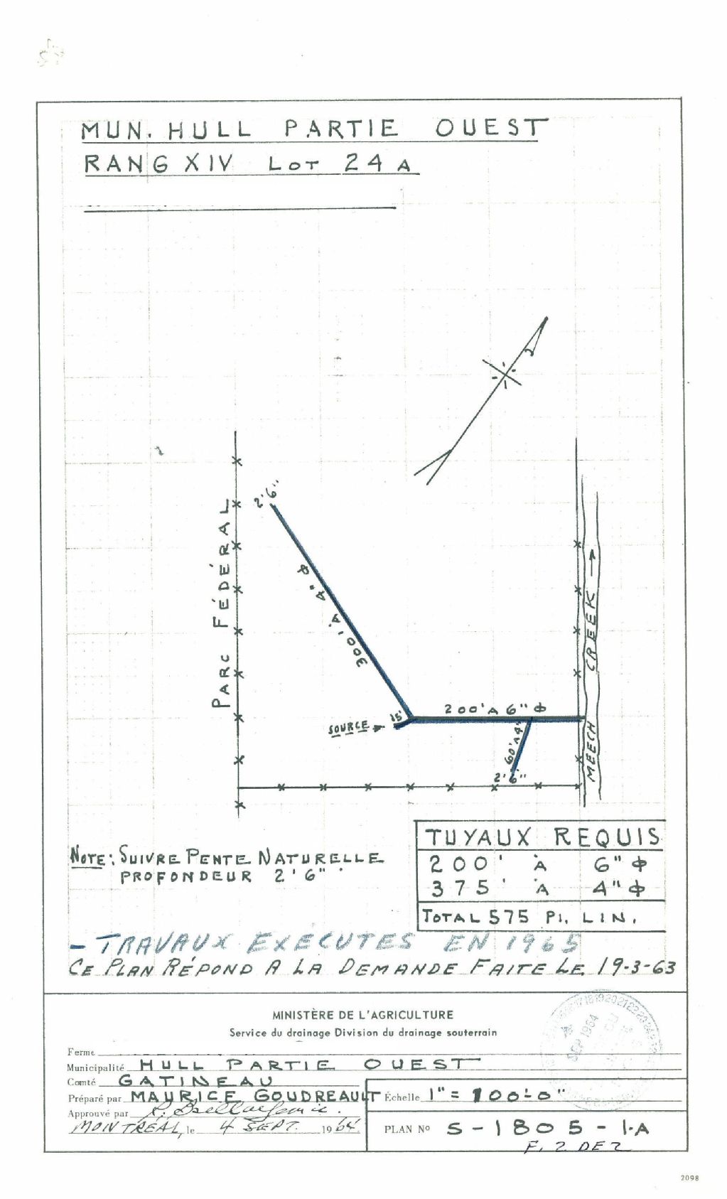 Plan de drainage souterrain annoté pour la municipalité de Hull (partie ouest), comté de Gatineau. Préparé pour le compte du Ministère de l¿Agriculture du Québec.