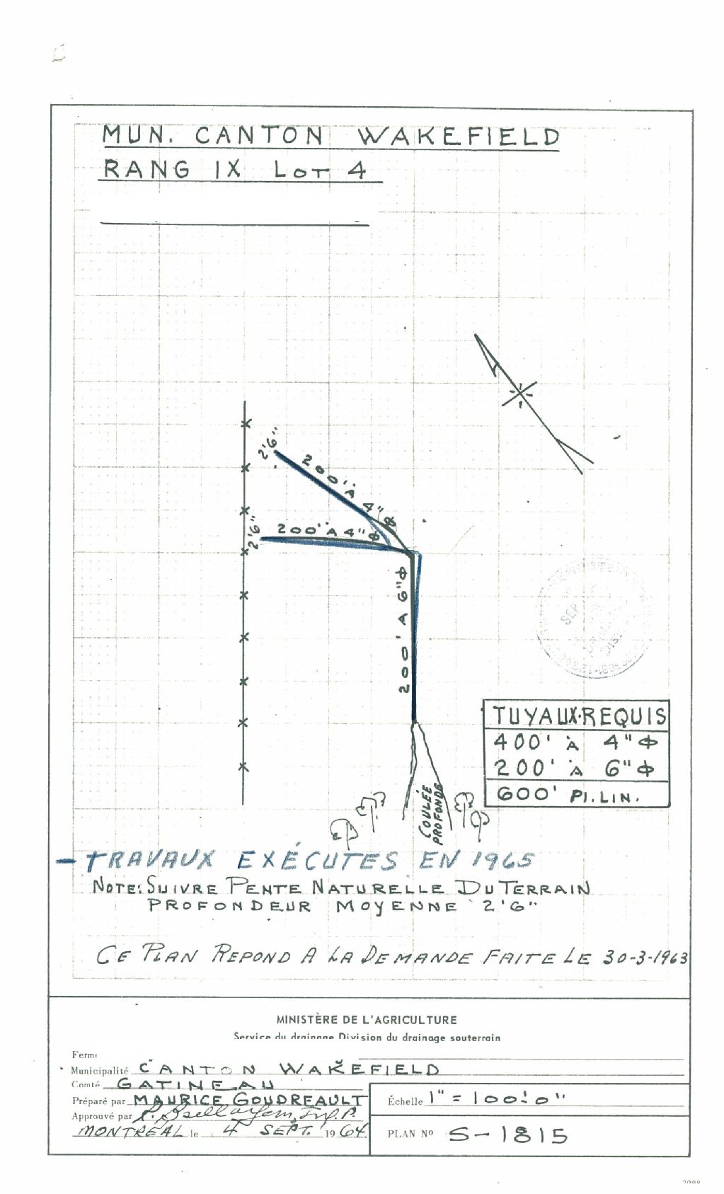 Plan de drainage souterrain annoté pour la municipalité du canton de Wakefield, comté de Gatineau. Préparé pour le compte du Ministère de l¿Agriculture du Québec.