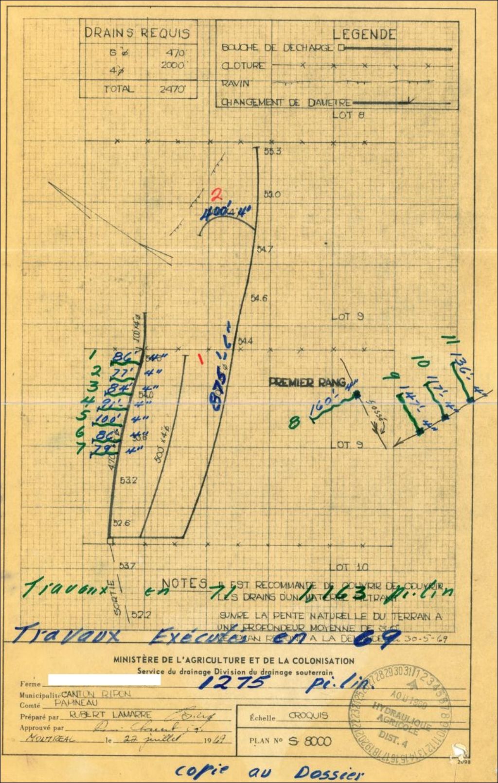 Plan de drainage souterrain annoté pour la municipalité du canton de Ripon, comté de Papineau. Préparé pour le compte du Ministère de l¿Agriculture et de la Colonisation du Québec.
