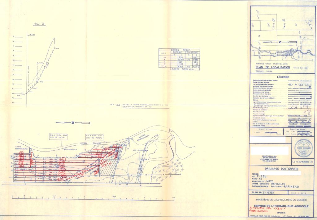 Plan de drainage souterrain annoté pour la municipalité de Mayo, comté de Papineau. Préparé pour le compte du Ministère de l¿Agriculture du Québec.