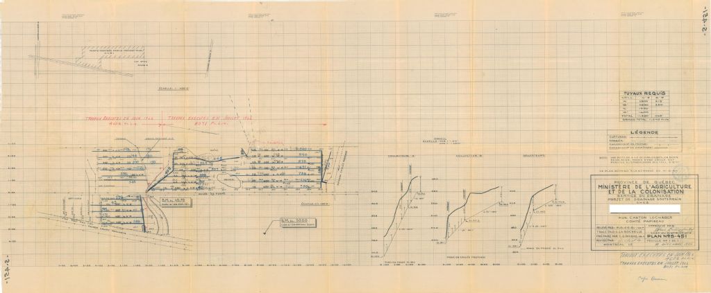 Plan de drainage souterrain annoté pour la municipalité du canton de Lochaber, comté de Papineau. Préparé pour le compte du Ministère de l¿Agriculture et de la Colonisation du Québec.