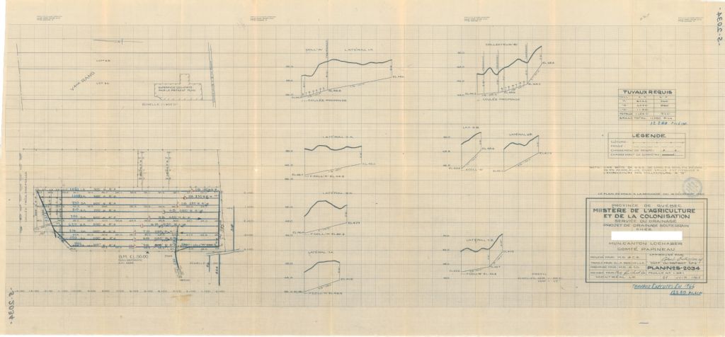 Plan de drainage souterrain annoté pour la municipalité du canton de Lochaber, comté de Papineau. Préparé pour le compte du Ministère de l¿Agriculture et de la Colonisation du Québec.