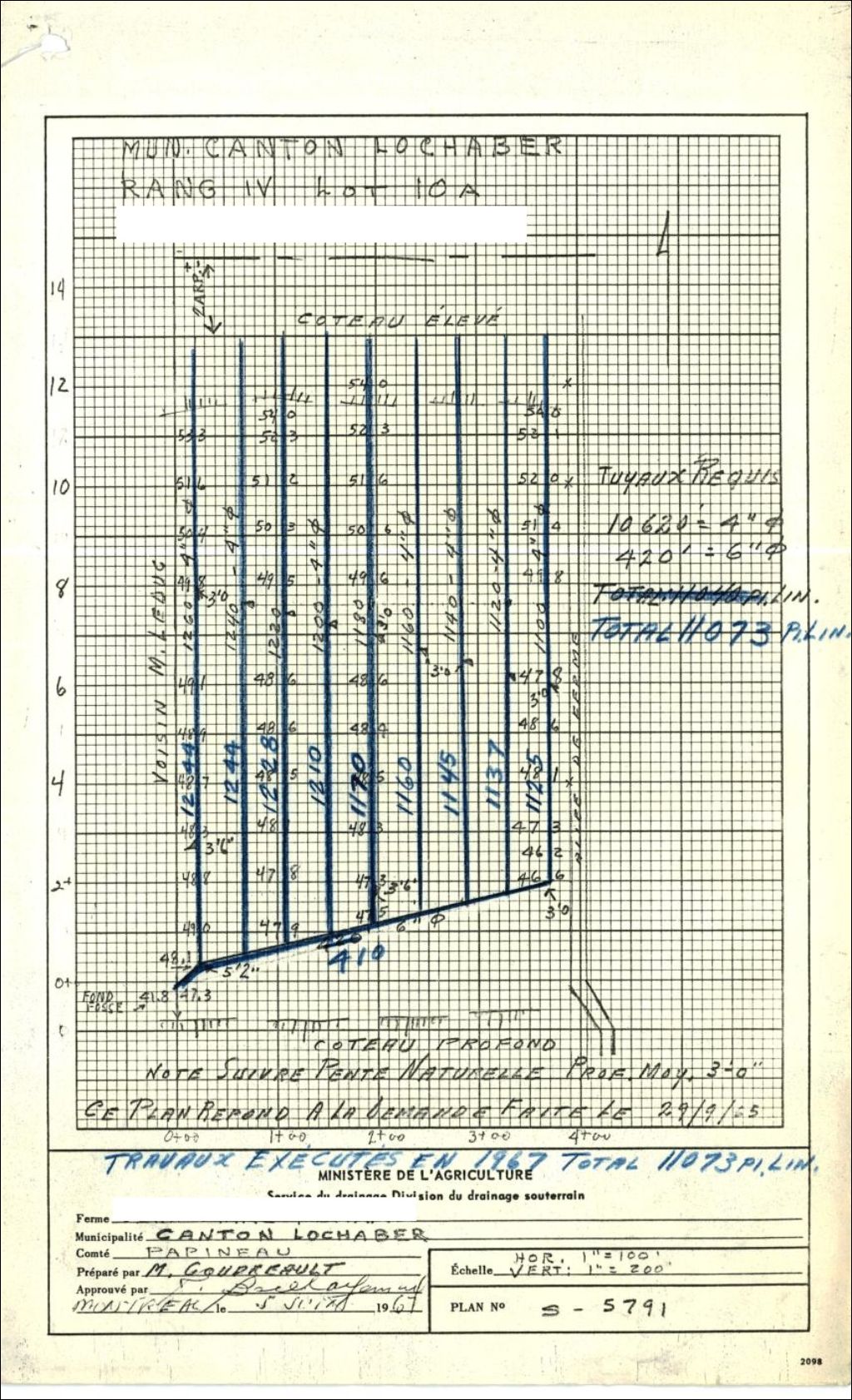Plan de drainage souterrain annoté pour la municipalité du canton de Lochaber, comté de Papineau. Préparé pour le compte du Ministère de l¿Agriculture du Québec.