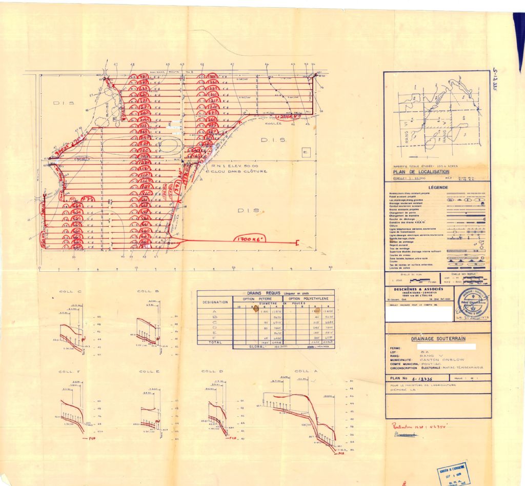 Plan de drainage souterrain annoté pour la municipalité du canton d'Onslow, comté de Pontiac. Préparé pour le compte du Ministère de l¿Agriculture du Québec.