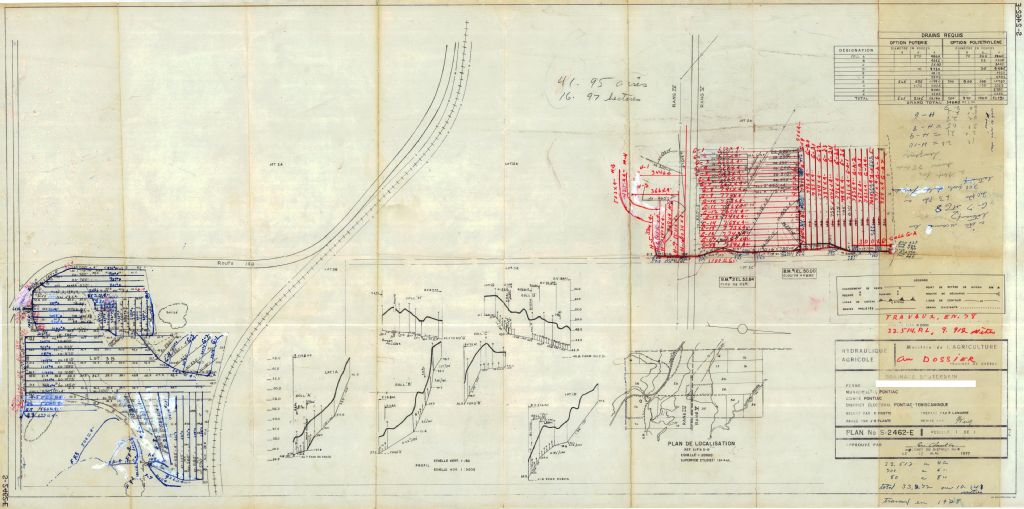 Plan de drainage souterrain annoté pour la municipalité de Pontiac. Préparé pour le compte du Ministère de l¿Agriculture du Québec.