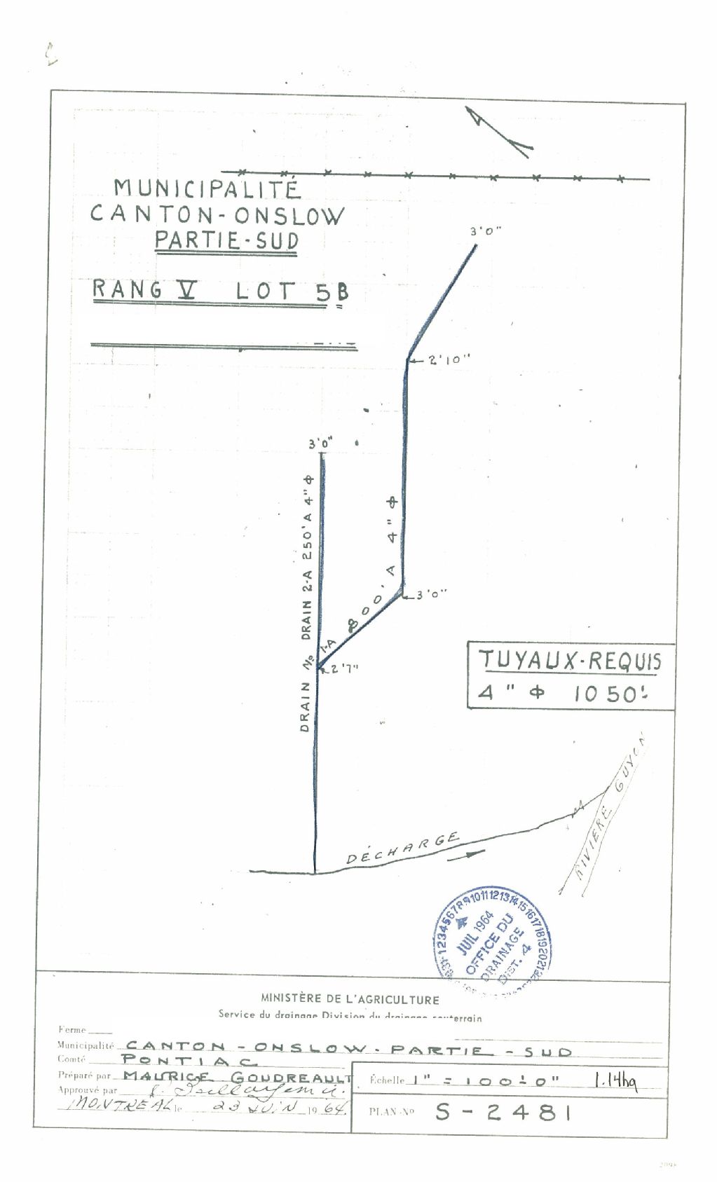 Plan de drainage souterrain pour la municipalité du canton d'Onslow (partie sud), comté de Pontiac. Préparé pour le compte du Ministère de l¿Agriculture du Québec.