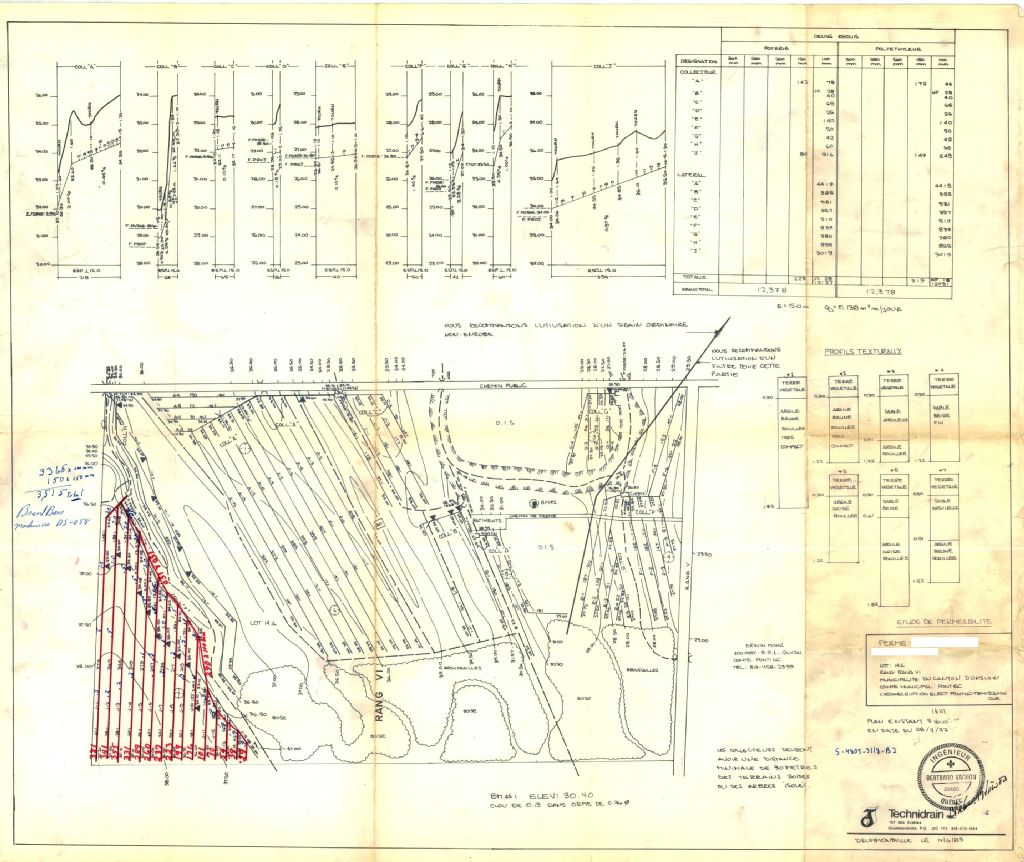Plan de drainage souterrain annoté (étude de perméabilité) pour la municipalité du canton d'Onslow, comté de Pontiac. Préparé pour le compte du Ministère de l¿Agriculture du Québec.