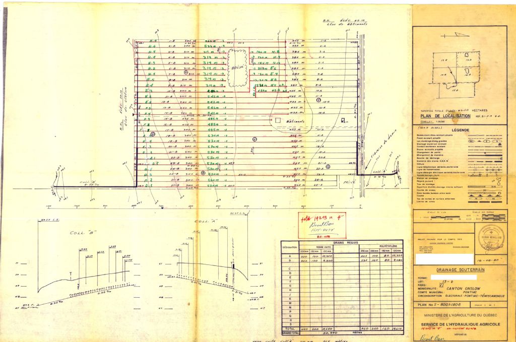 Plan de drainage souterrain annoté pour la municipalité du canton d'Onslow, comté de Pontiac. Préparé pour le compte du Ministère de l¿Agriculture du Québec.