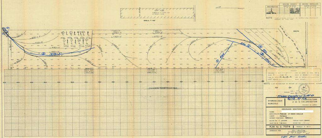Plan de drainage souterrain annoté pour la municipalité de St-André-Avellin, comté de Papineau. Préparé pour le compte du Ministère de l¿Agriculture et de la Colonisation du Québec.
