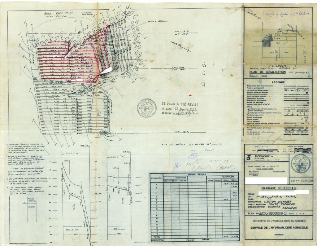 Plan de drainage souterrain annoté pour la municipalité du canton de Lochaber, comté de Papineau. Préparé pour le compte du Ministère de l¿Agriculture du Québec.