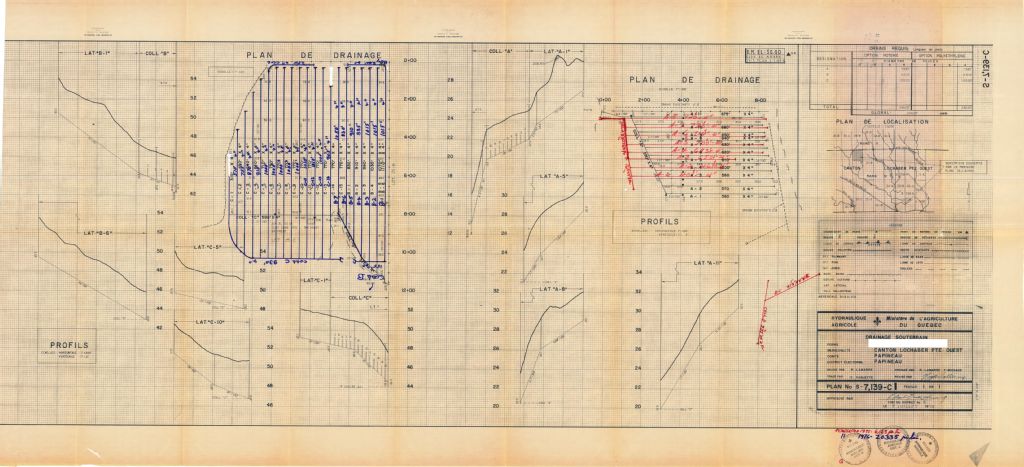 Plan de drainage souterrain annoté pour la municipalité du canton de Lochaber (partie ouest), comté de Papineau. Préparé pour le compte du Ministère de l¿Agriculture du Québec.