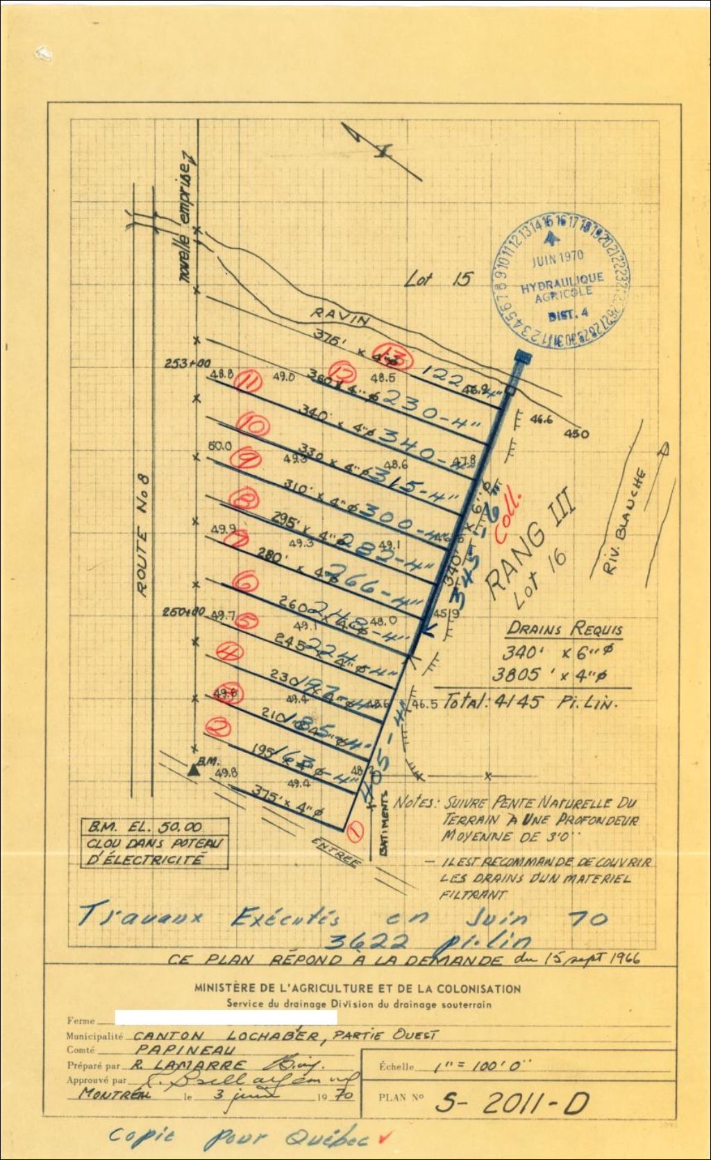 Plan de drainage souterrain annoté pour la municipalité du canton de Lochaber (partie ouest), comté de Papineau. Préparé pour le compte du Ministère de l¿Agriculture et de la Colonisation du Québec.