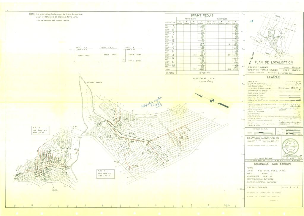 Plan de drainage souterrain annoté pour la municipalité du canton de Low, comté de Gatineau. Préparé pour le compte du Ministère de l¿Agriculture du Québec.