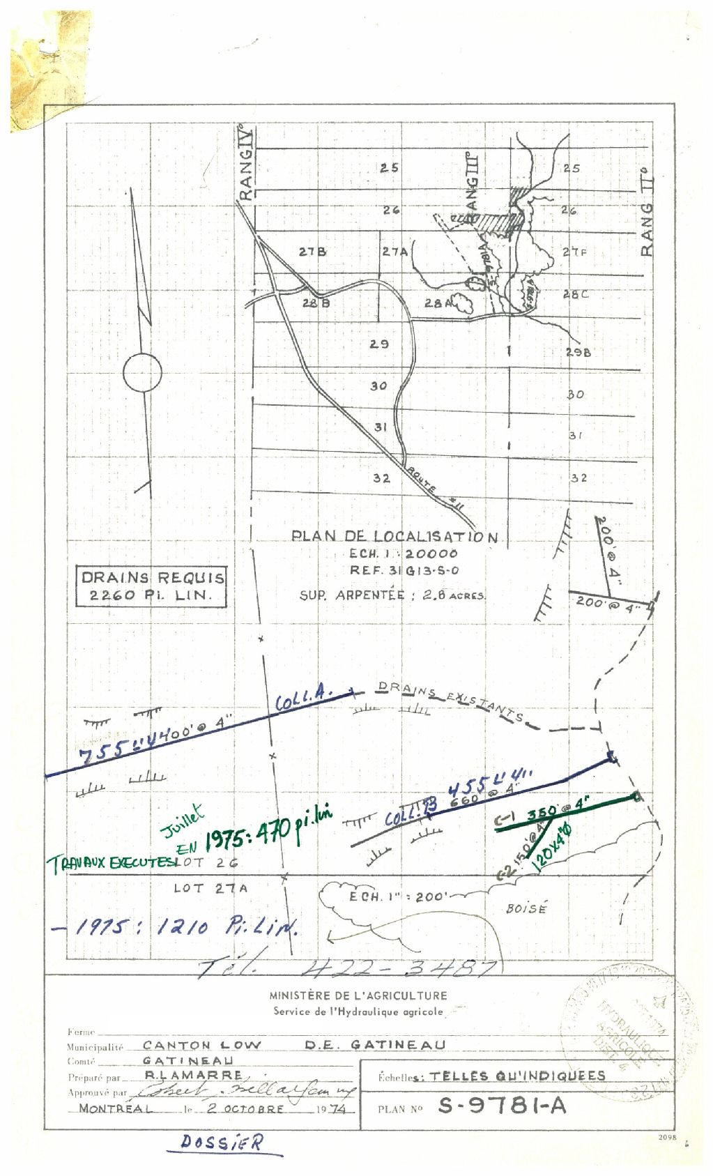 Plan de drainage souterrain annoté pour la municipalité du canton de Low, comté de Gatineau. Préparé pour le compte du Ministère de l¿Agriculture du Québec.