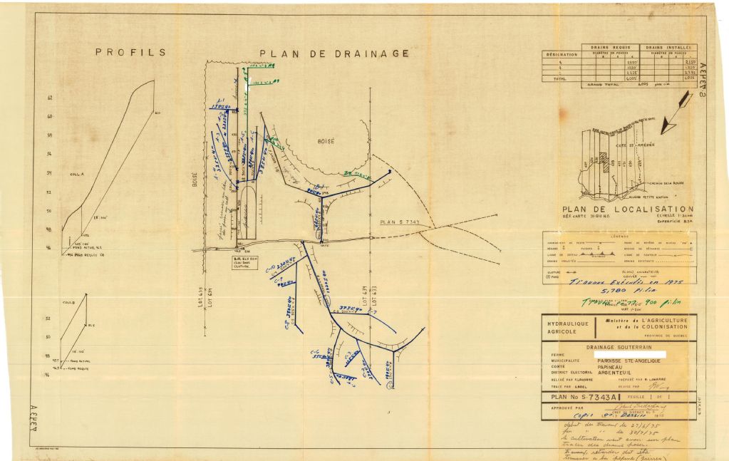 Plan de drainage souterrain annoté pour la paroisse Ste-Angélique, comté de Papineau. Préparé pour le compte du Ministère de l¿Agriculture et de la Colonisation du Québec.