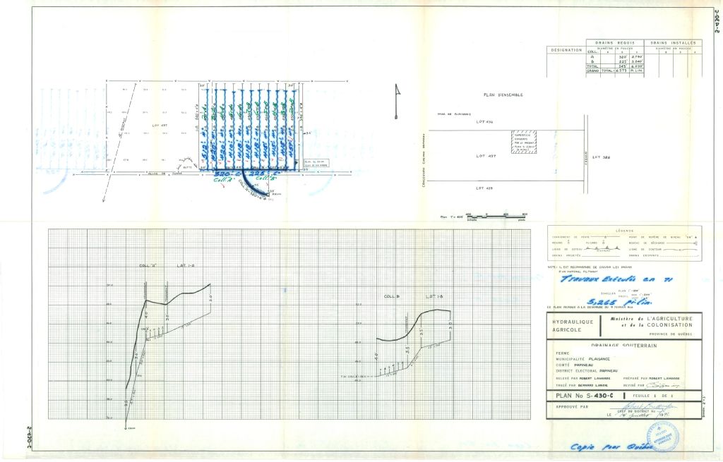 Plan de drainage souterrain annoté pour la municipalité de Plaisance, comté de Papineau. Préparé pour le compte du Ministère de l¿Agriculture et de la Colonisation du Québec.