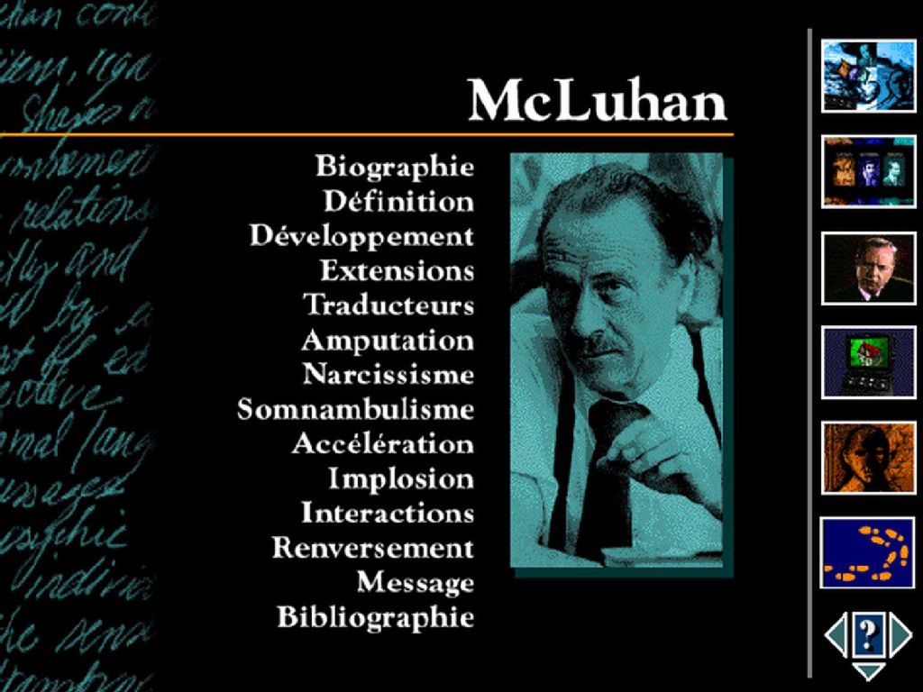 - Ce dossier porte sur le film Immédia, version courte avec commentaire.''Immédia a été conçu dans le but d¿illustrer l¿évolution des technologies de communication. Un environnement encyclopédique interactif intégrant textes, graphiques, voix, son et vidéo incite à l¿exploration de ce sujet. Des faits historiques sur différents médias sont regroupés en trois périodes : Lascaux, Gutenberg et Marconi. Chacun de ces paysages temporels peut être interprété en utilisant quatre points de vue différents :McLuhan - un survol des idées clés de ce philosophe des médiasSens - une approche esthétique à partir de signets visuelsHyperimage - un récit historique animéSchéma - une illustration graphique de l¿évolution des médiasTout en partageant des références historiques communes, ces mondes parallèles dirigent l¿attention de l¿utilisateur sur différents parcours. La redondance suscitée par ces multiples points de vue sur un même objet vise à faciliter [...]