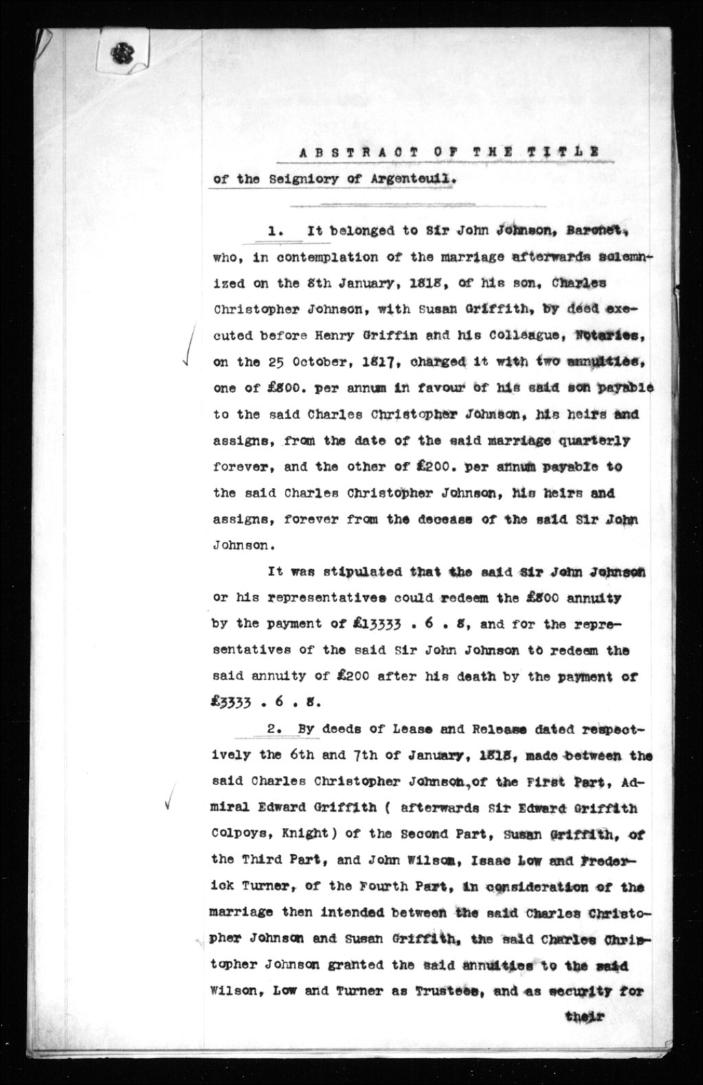Ce dossier contient l'historique de la seigneurie et de ses titres (1817-1901) et l'Abstract of the Title of the Seigniory of Argenteuil 1879