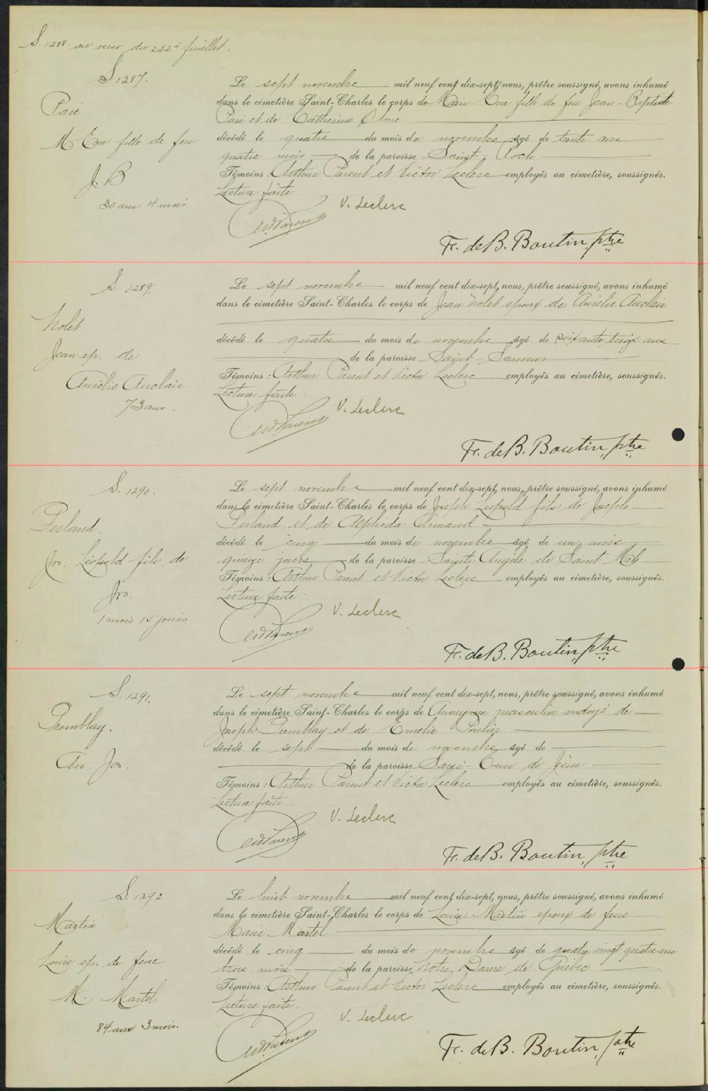 - Registres de la Compagnie du cimetière Saint-Charles contenant les sépultures de certaines paroisses dont Saint-Roch-de-Québec (CE301,S22) ; Notre-Dame-de-Jacques-Cartier (CE301,S33) ; Saint-Sauveur (CE301,S96) ; Saint-Zéphirin-de-Stadacona (CE301,S101) ; Saint-Charles-de-Limoilou (CE301,S117) et Saint-Angèle-de-Saint-Malo (CE301,S118) à partir de 1914
