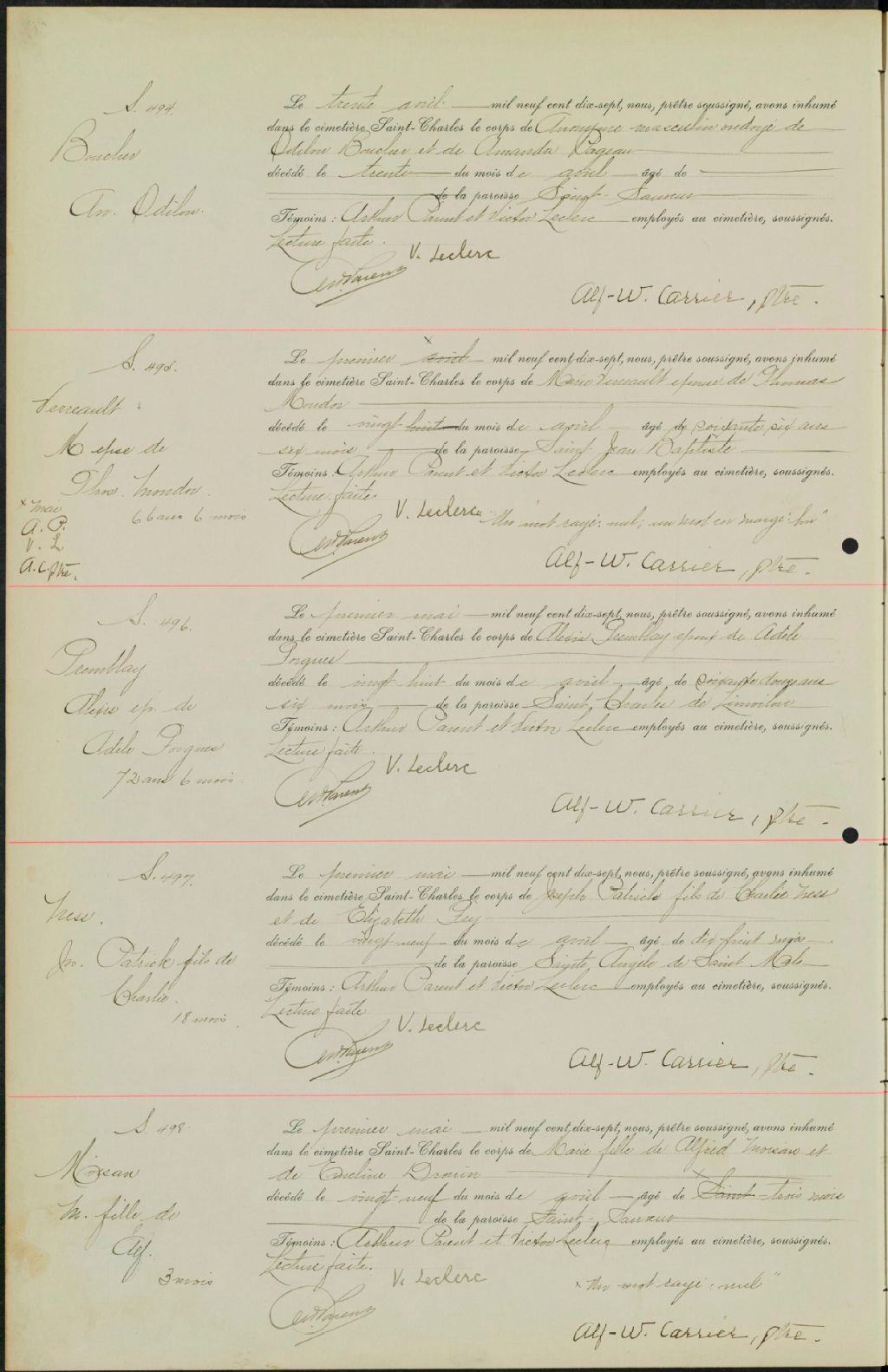 - Registres de la Compagnie du cimetière Saint-Charles contenant les sépultures de certaines paroisses dont Saint-Roch-de-Québec (CE301,S22) ; Notre-Dame-de-Jacques-Cartier (CE301,S33) ; Saint-Sauveur (CE301,S96) ; Saint-Zéphirin-de-Stadacona (CE301,S101) ; Saint-Charles-de-Limoilou (CE301,S117) et Saint-Angèle-de-Saint-Malo (CE301,S118) à partir de 1914
