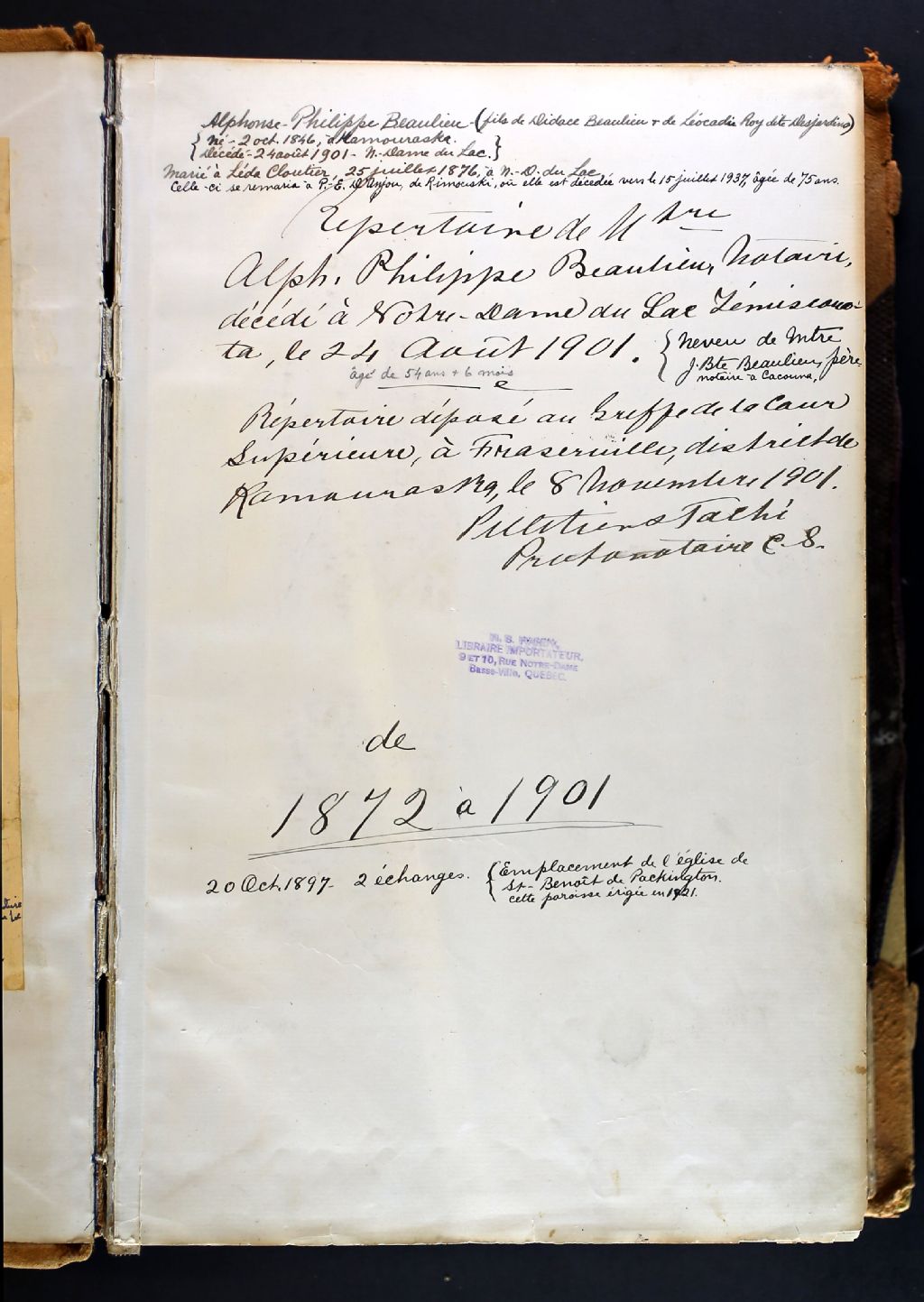 Alphonse-Philippe Beaulieu, 1872-1901, Archives nationales à Rimouski, Fonds Cour supérieure. District judiciaire de Kamouraska. Greffes de notaires, (01R,CN104,S87).